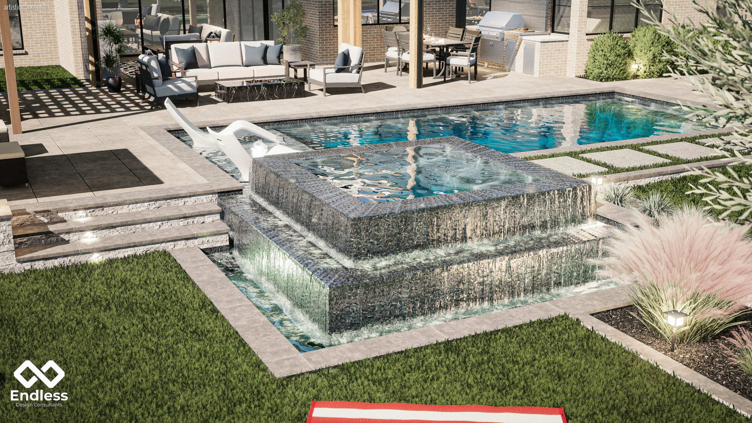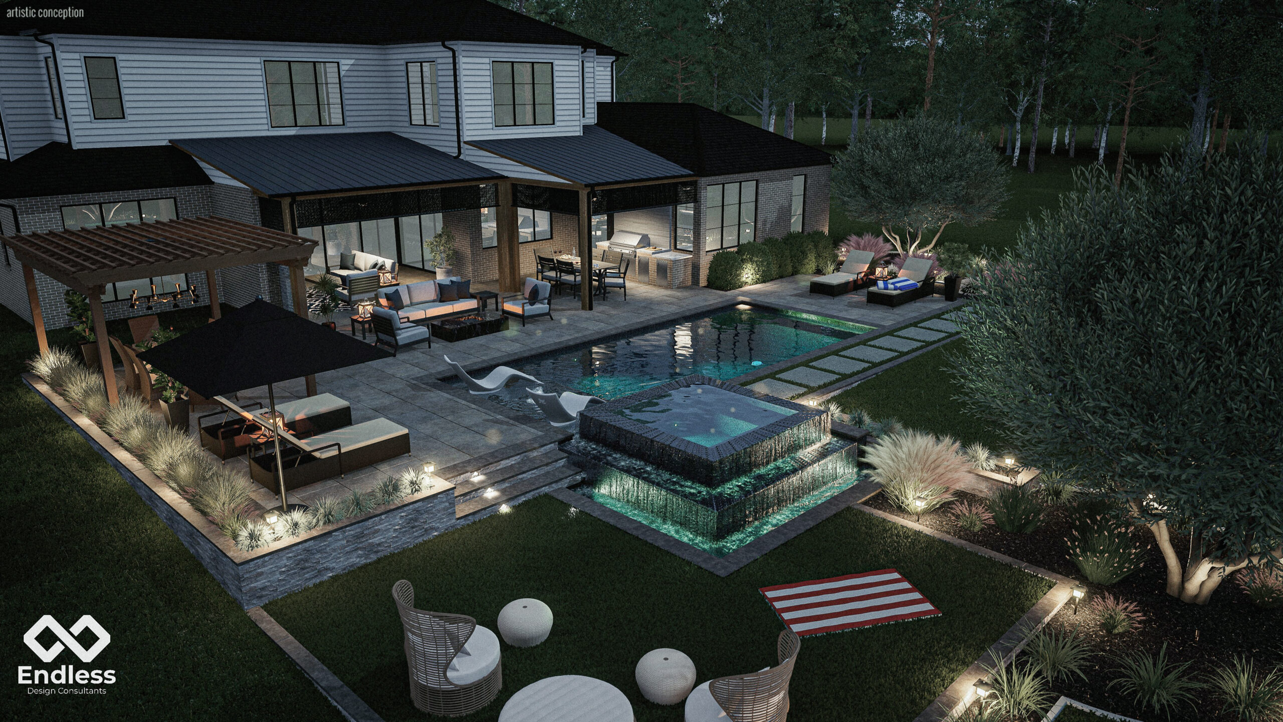 The design is anchored by a sleek rectangular pool with a tanning ledge, complemented by a raised, multi-tier spillover spa that doubles as a standout water feature. Layered hardscape zones define lounging, dining, and outdoor kitchen areas, while structured planting beds and low landscape lighting soften the geometry and add depth—making the space feel equally finished in daytime and at night.
