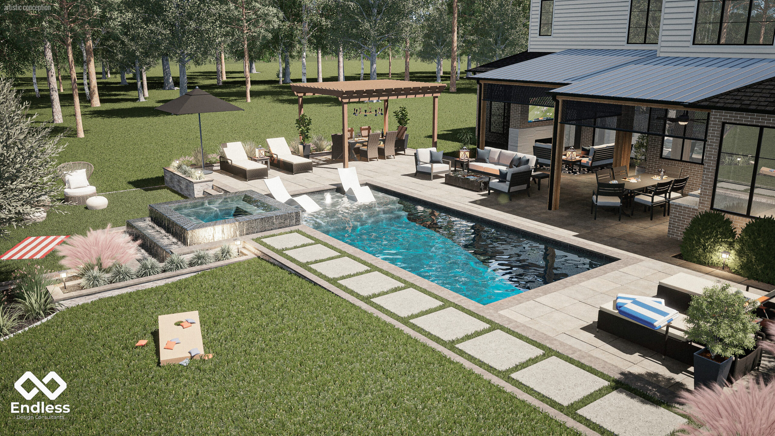 This project creates a modern outdoor living space where the pool, patios, and home’s rear elevation read as one clean, intentional composition. The layout focuses on open circulation, strong indoor–outdoor connection, and a resort-style atmosphere that still feels tailored to the architecture.