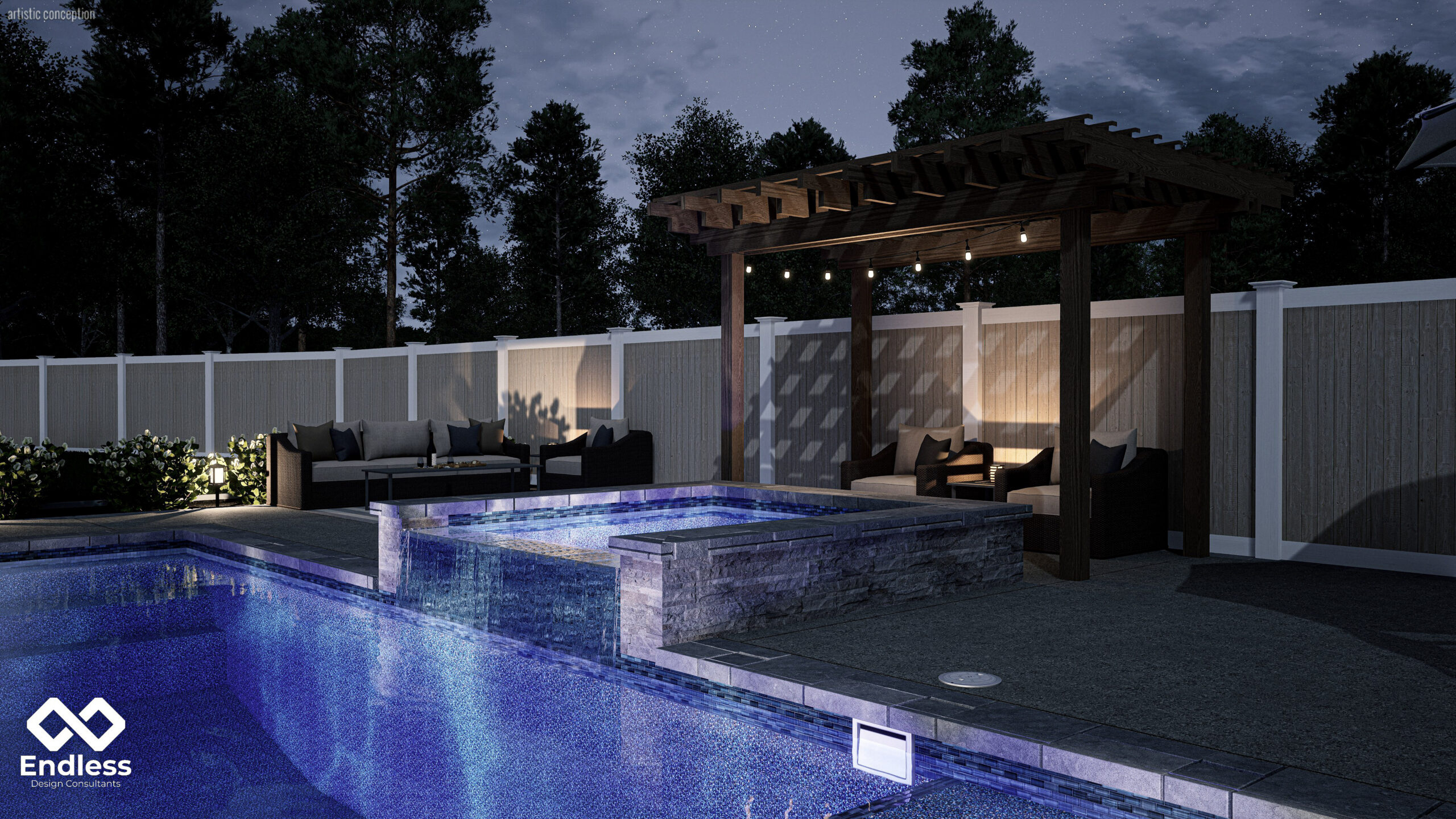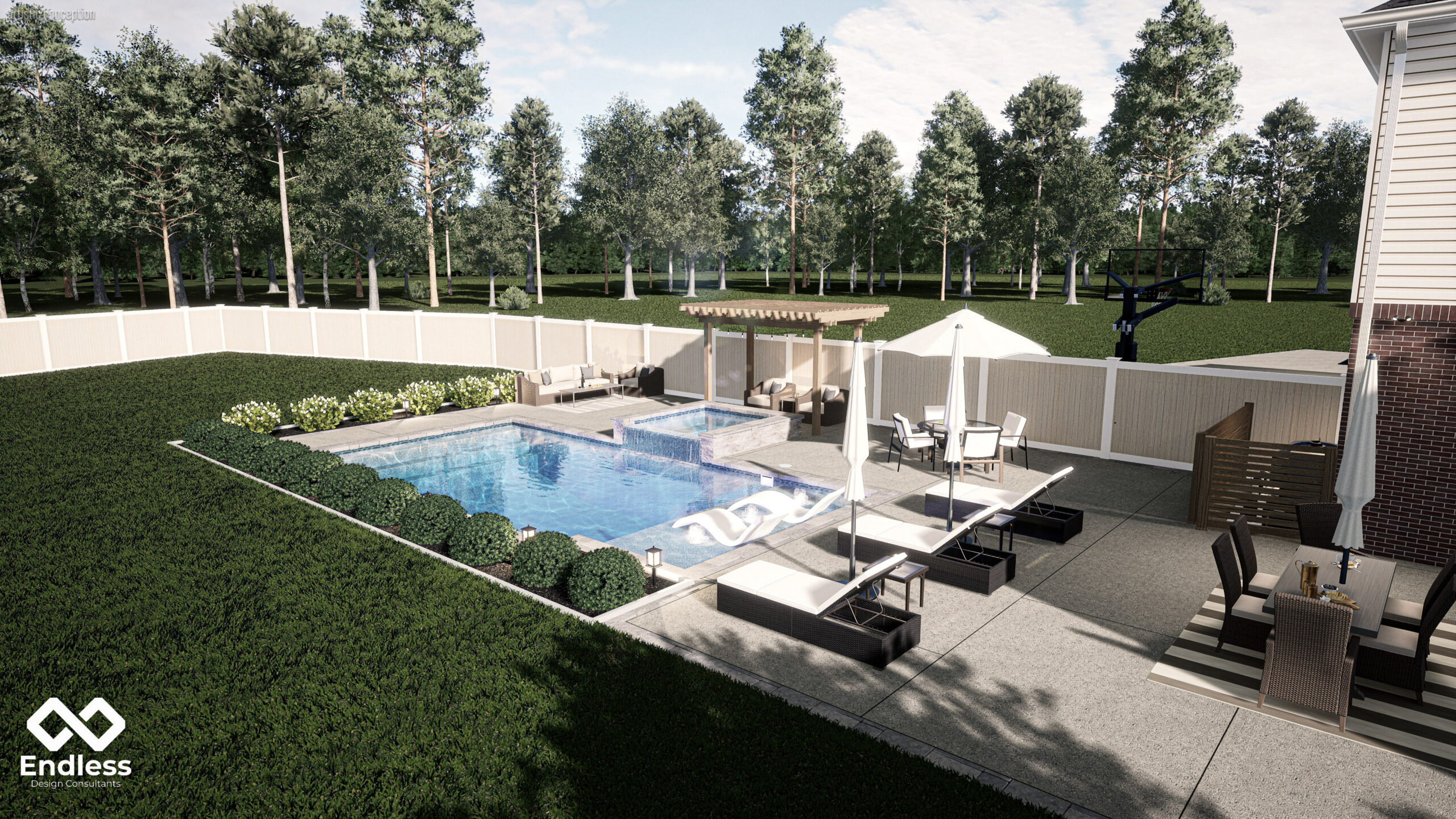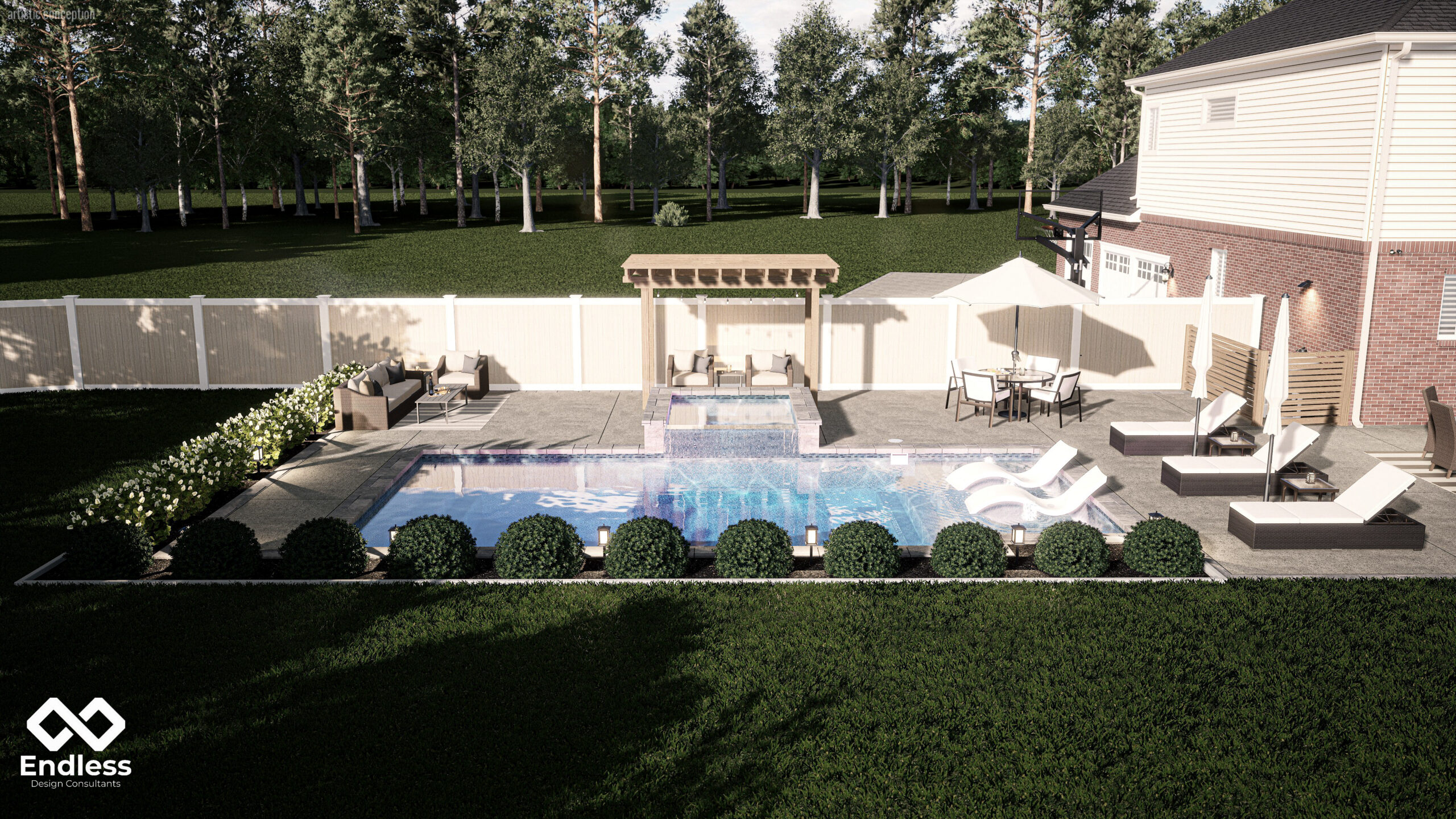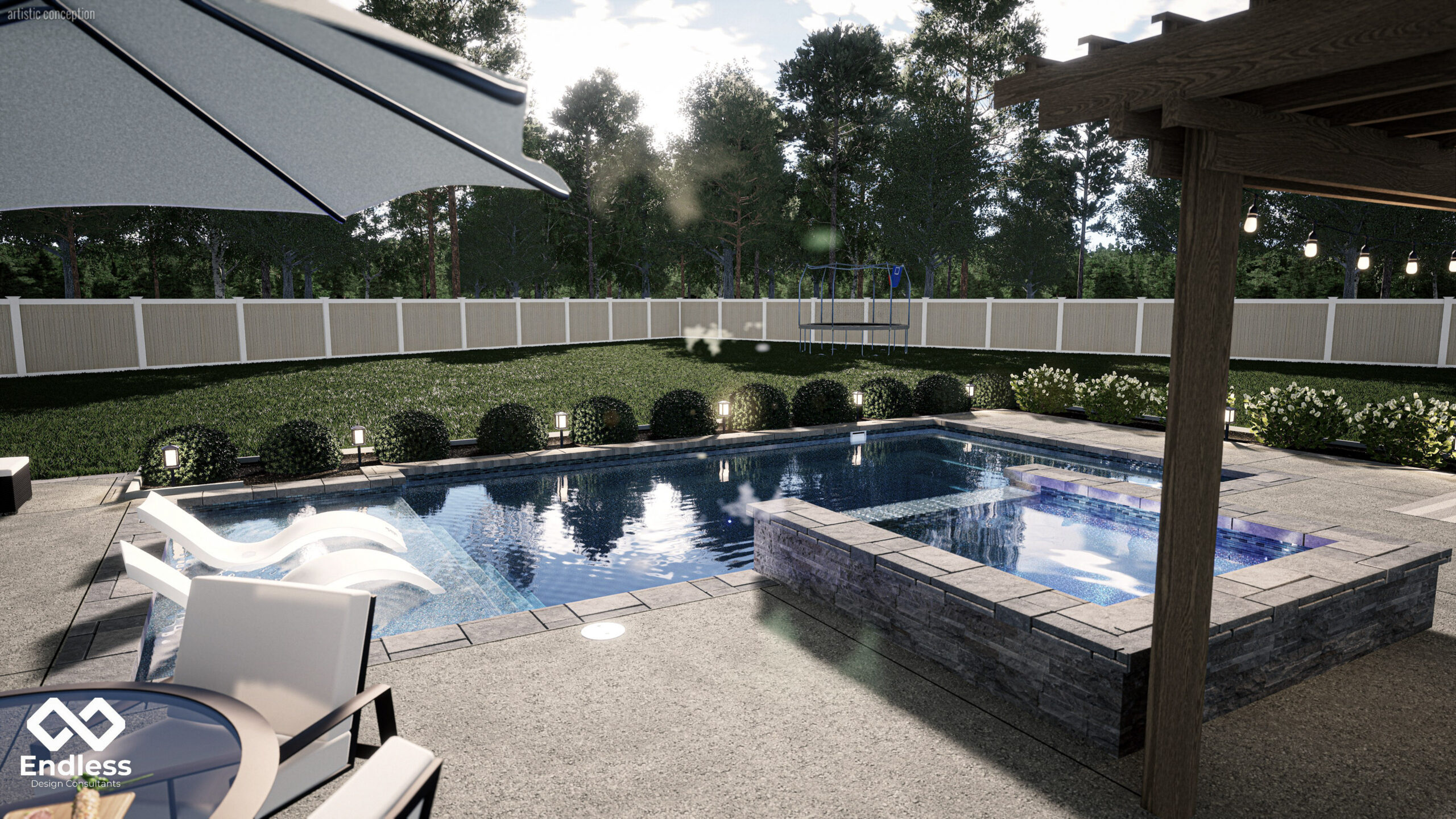 This design focuses on clean simplicity and comfort, transforming a traditional backyard into a polished outdoor retreat built for everyday living. A crisp rectangular pool anchors the layout, paired with a raised spa and spillway detail that adds structure, sound, and a resort style focal point without overpowering the space.