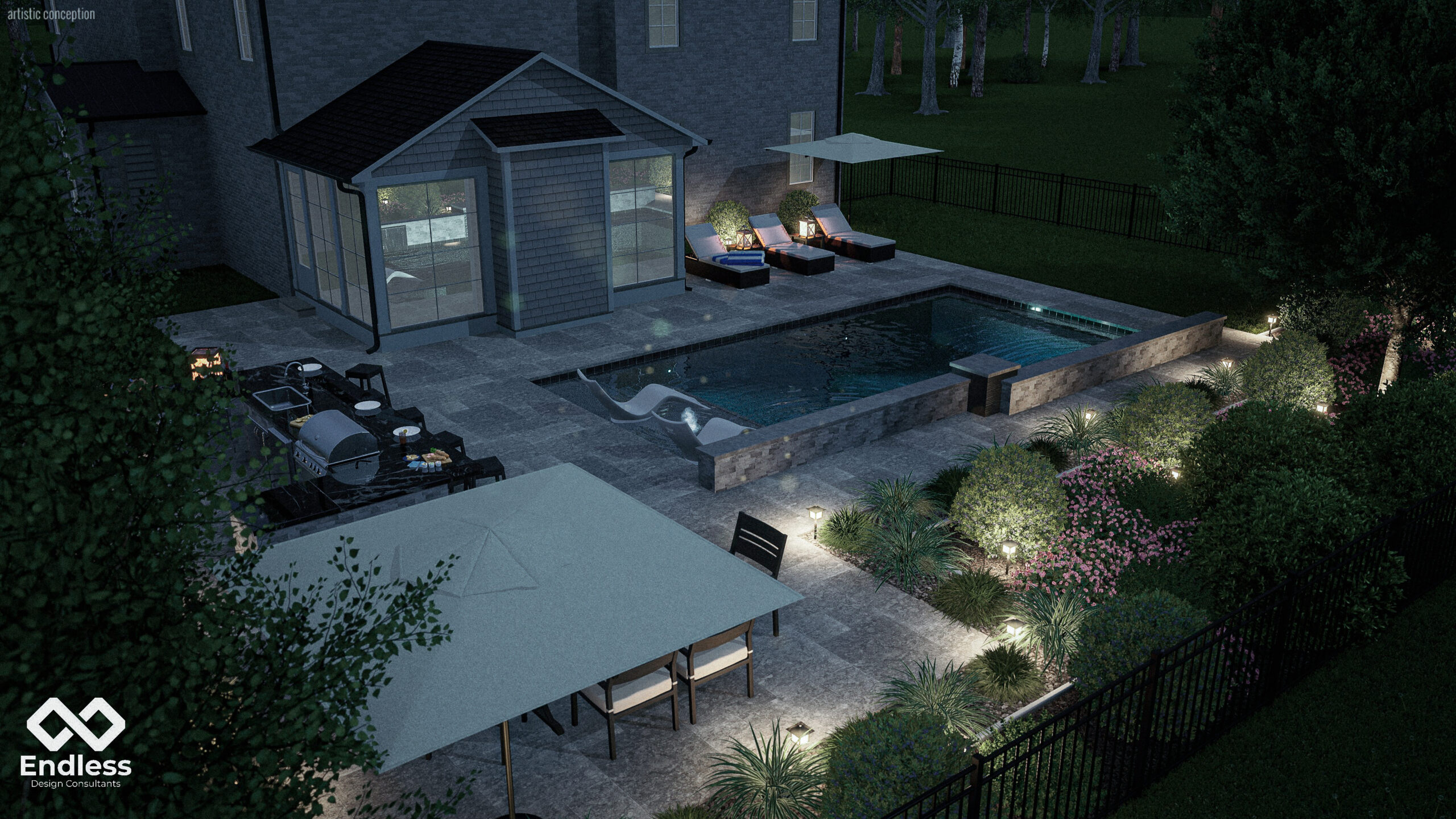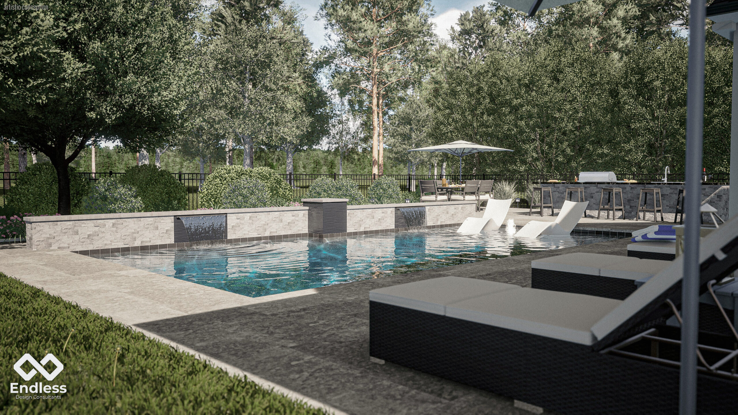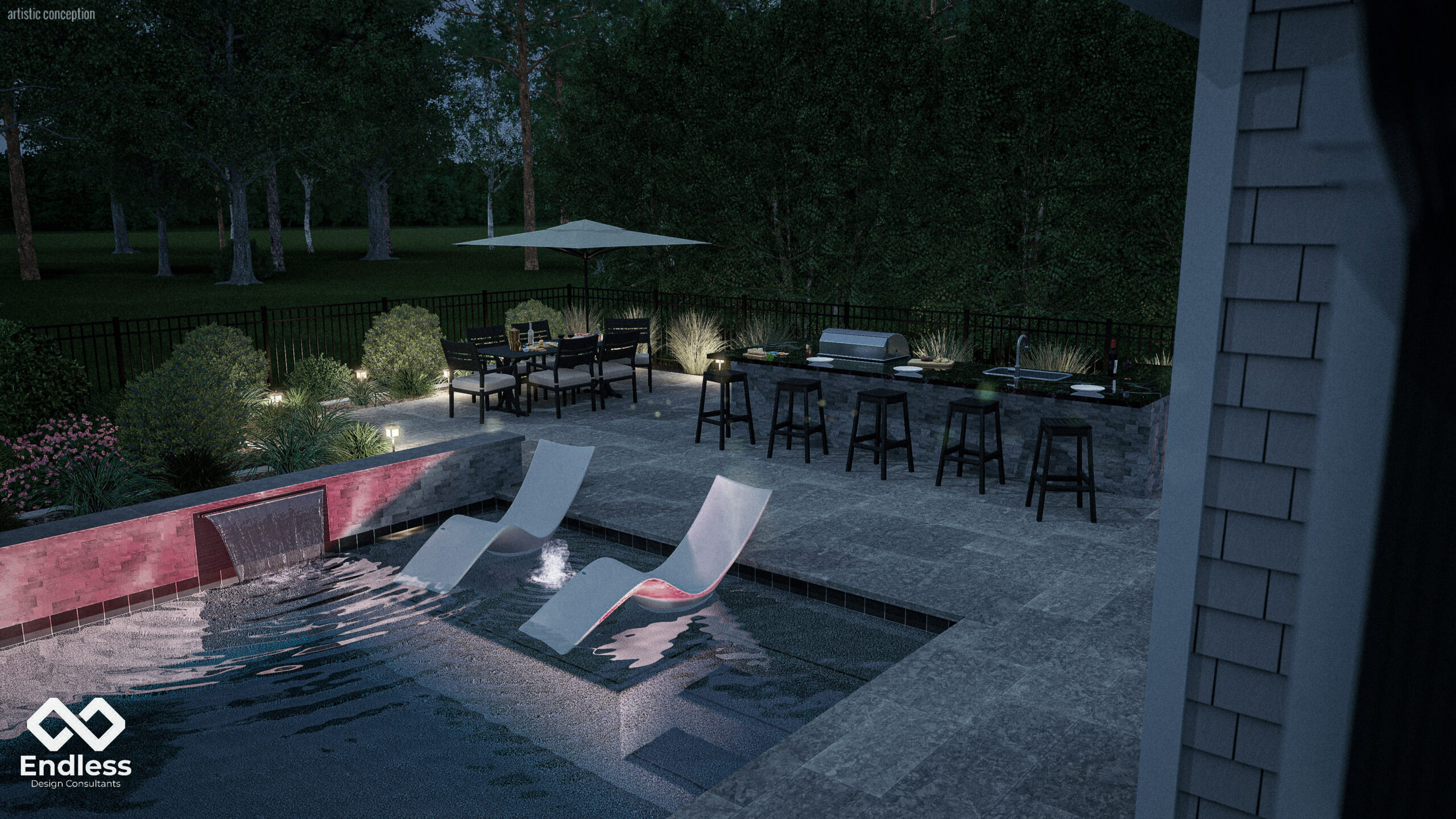 A raised stone feature wall anchors the far edge of the pool, adding texture and movement through dual sheer descents that bring sound and visual focus to the water. The layout balances active and relaxed zones—an in-water tanning ledge with loungers sits near the main circulation path, while the elevated entertaining area expands the experience with built-in seating and a full outdoor kitchen/bar. Low, layered landscaping and subtle lighting soften the hard edges and frame views without competing with the architecture.