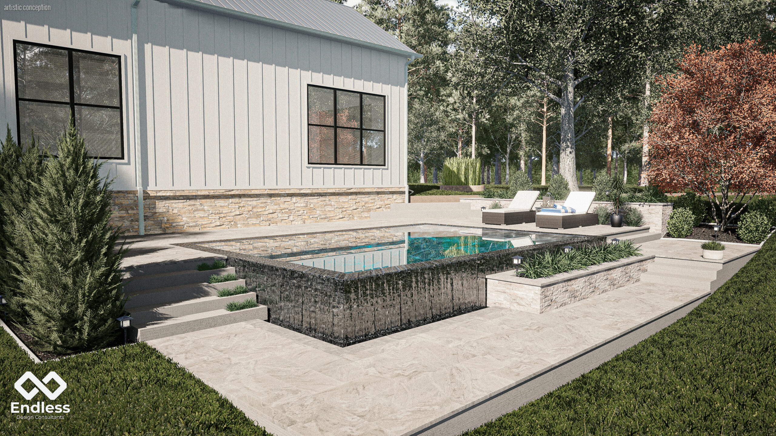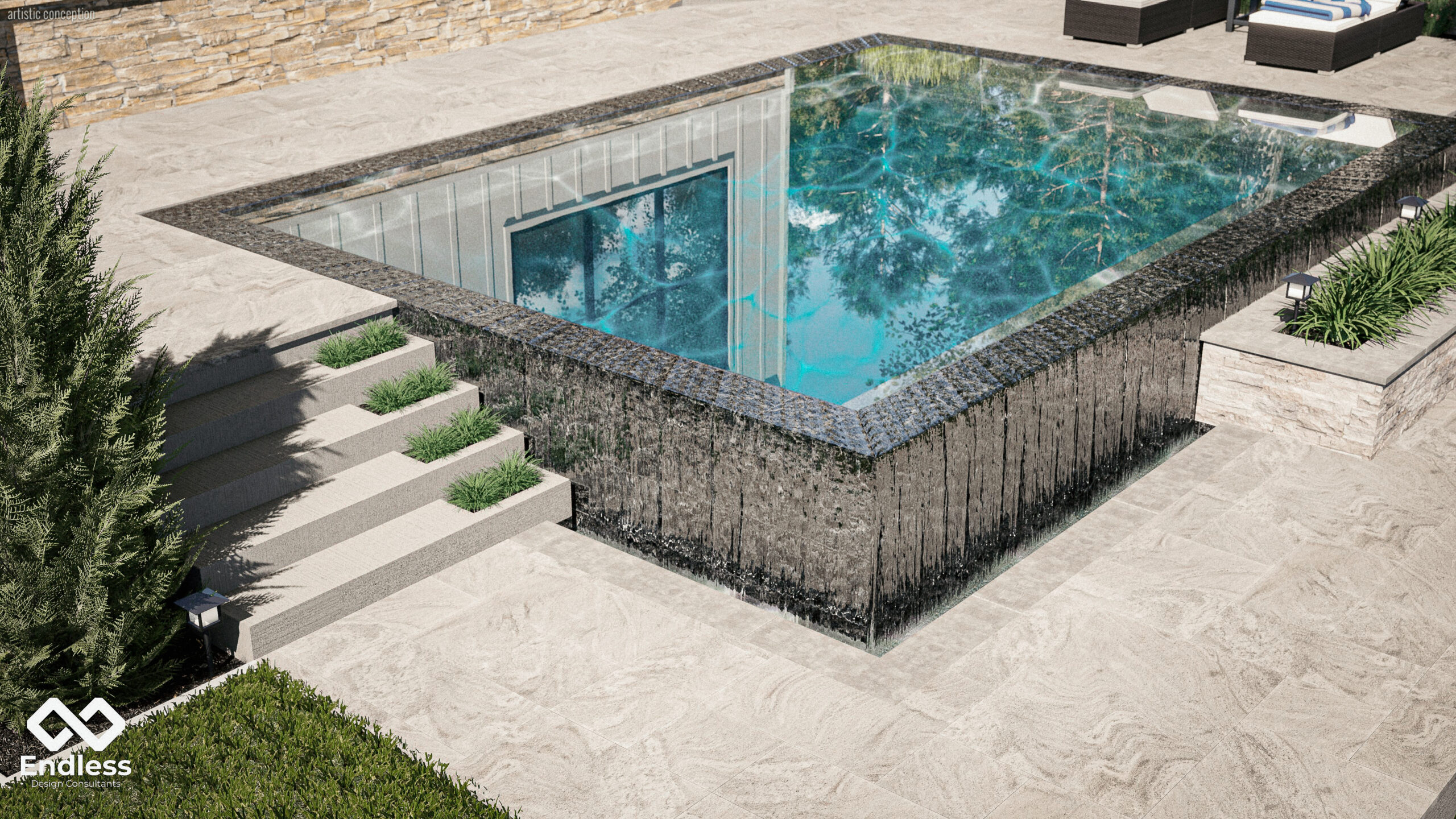 The focal point is the raised pool with a full perimeter overflow effect, creating a continuous, glassy water edge that spills into a recessed catch basin and adds motion without extra “features.” Broad-format paving, stacked-stone retaining walls, and terraced steps organize the grade changes, while integrated planters and low landscape lighting soften the hardscape and guide circulation. The result is a simple, elevated composition that feels modern, calm, and intentionally framed by the landscape.