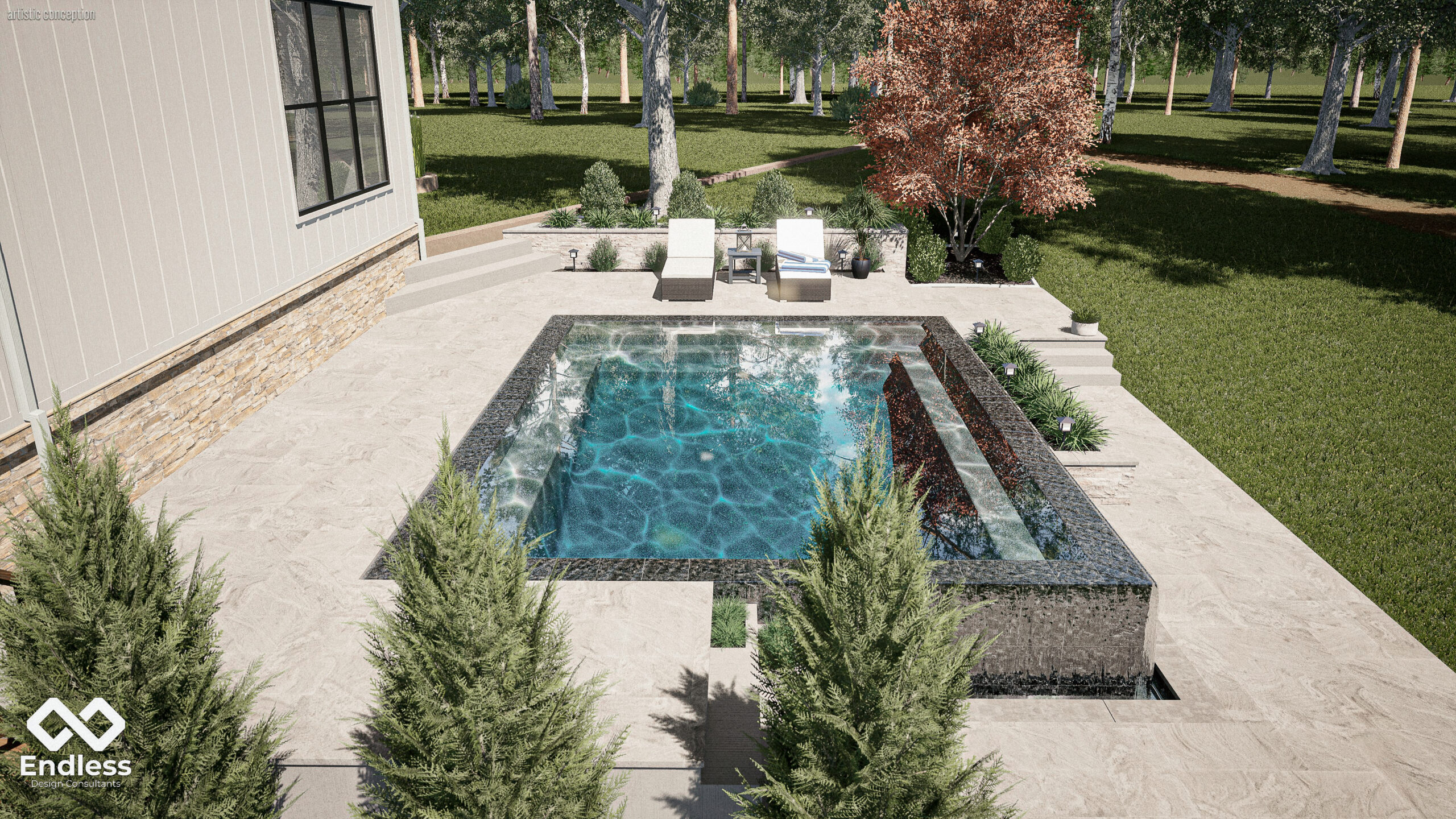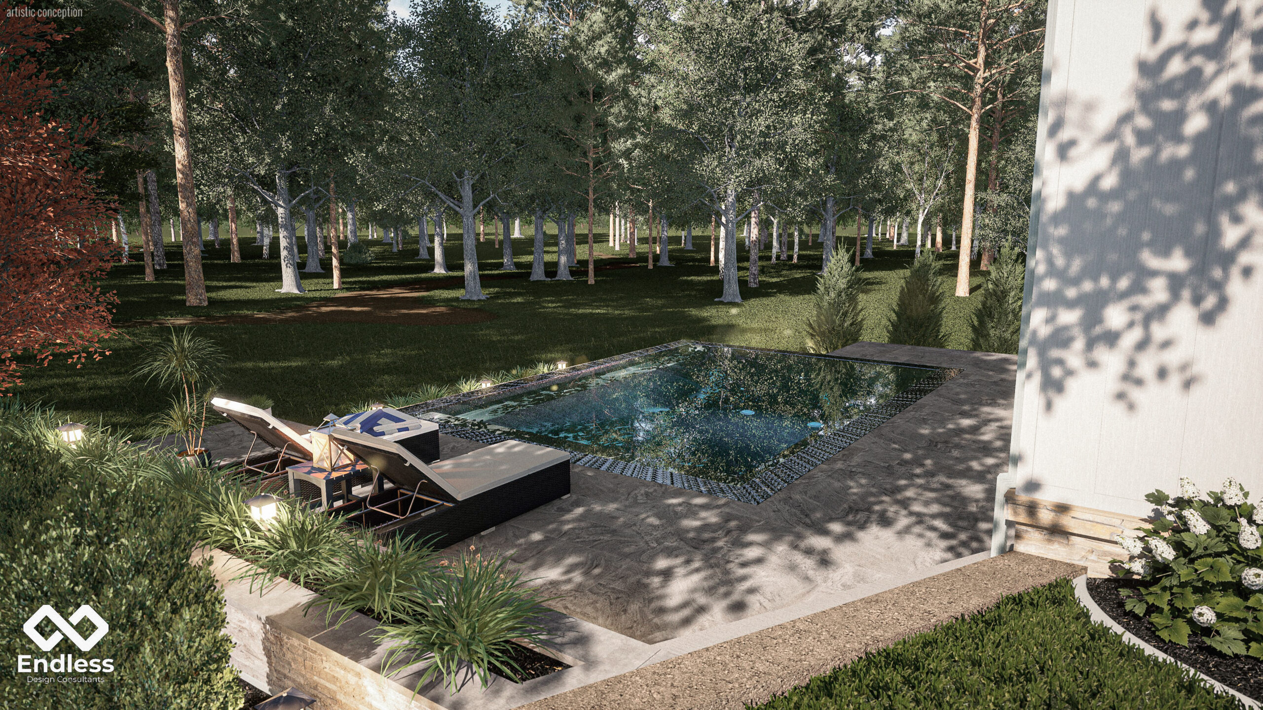 This project is designed as a quiet, architectural retreat where clean geometry and natural surroundings do the heavy lifting. A compact, rectilinear pool anchors the outdoor space, positioned to capture long views into the wooded backdrop while keeping the experience intimate and uncluttered.
