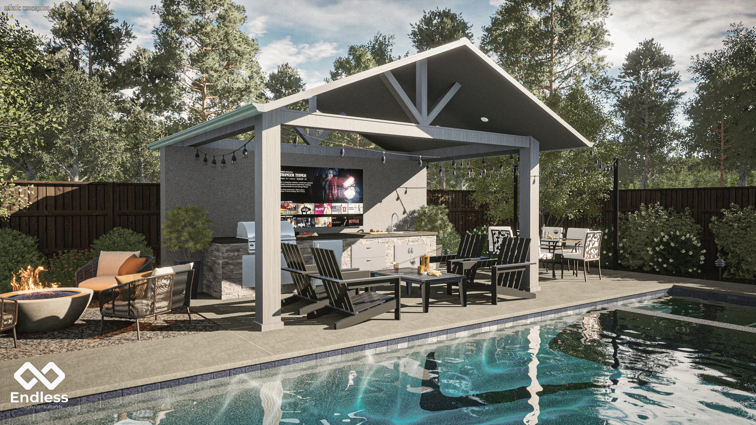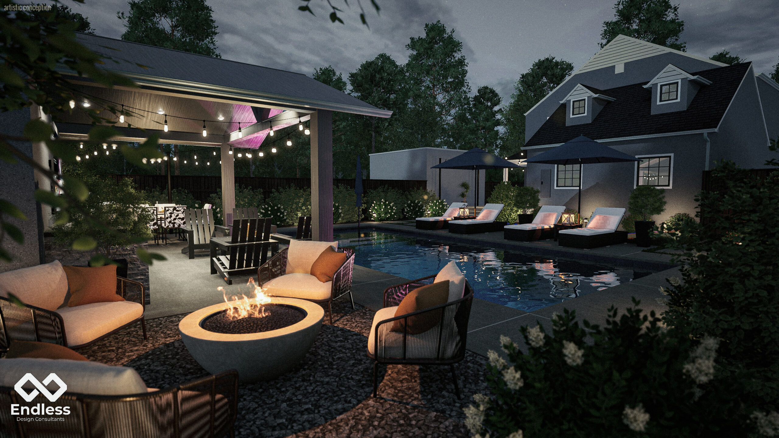 A custom pavilion anchors the space with an outdoor kitchen and media wall, creating a true “outdoor living room” for hosting day or night. The pool serves as the centerpiece, paired with generous lounging areas and a dedicated fire pit seating zone for a warm, social focal point after sunset. Soft landscape lighting, structured planting beds, and perimeter greenery add privacy and atmosphere while keeping the overall composition clean and modern.