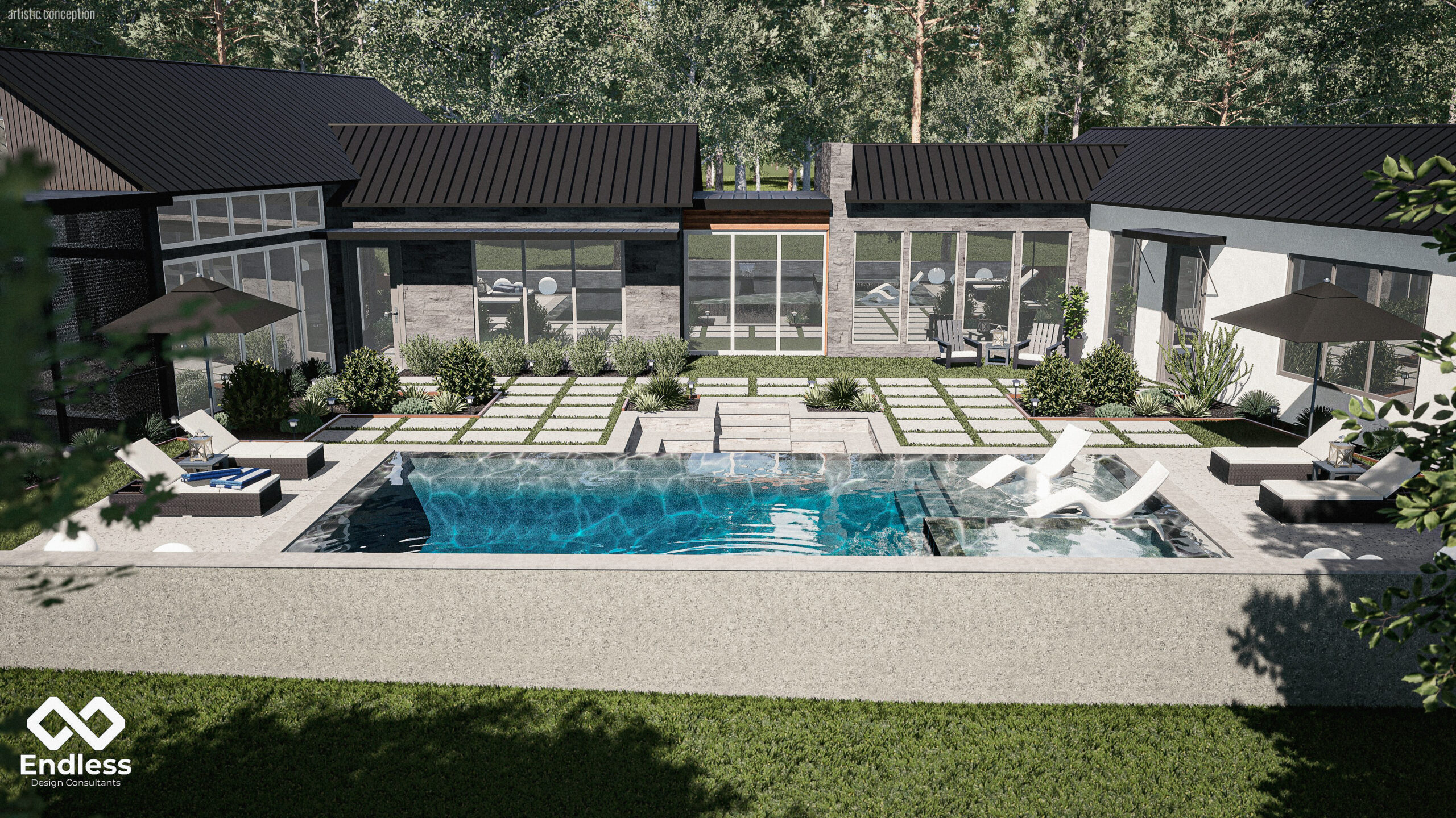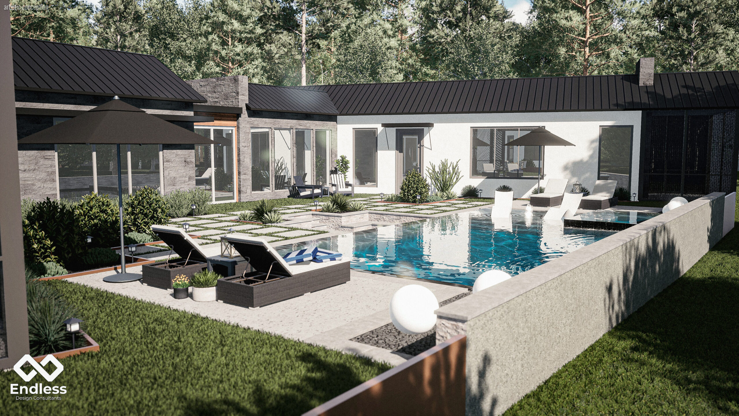 This project is organized around a modern courtyard layout where water, architecture, and landscape are tightly integrated into a unified outdoor experience. The pool serves as the central anchor, defined by clean geometry, layered stonework, and a restrained material palette that complements the home’s contemporary forms.