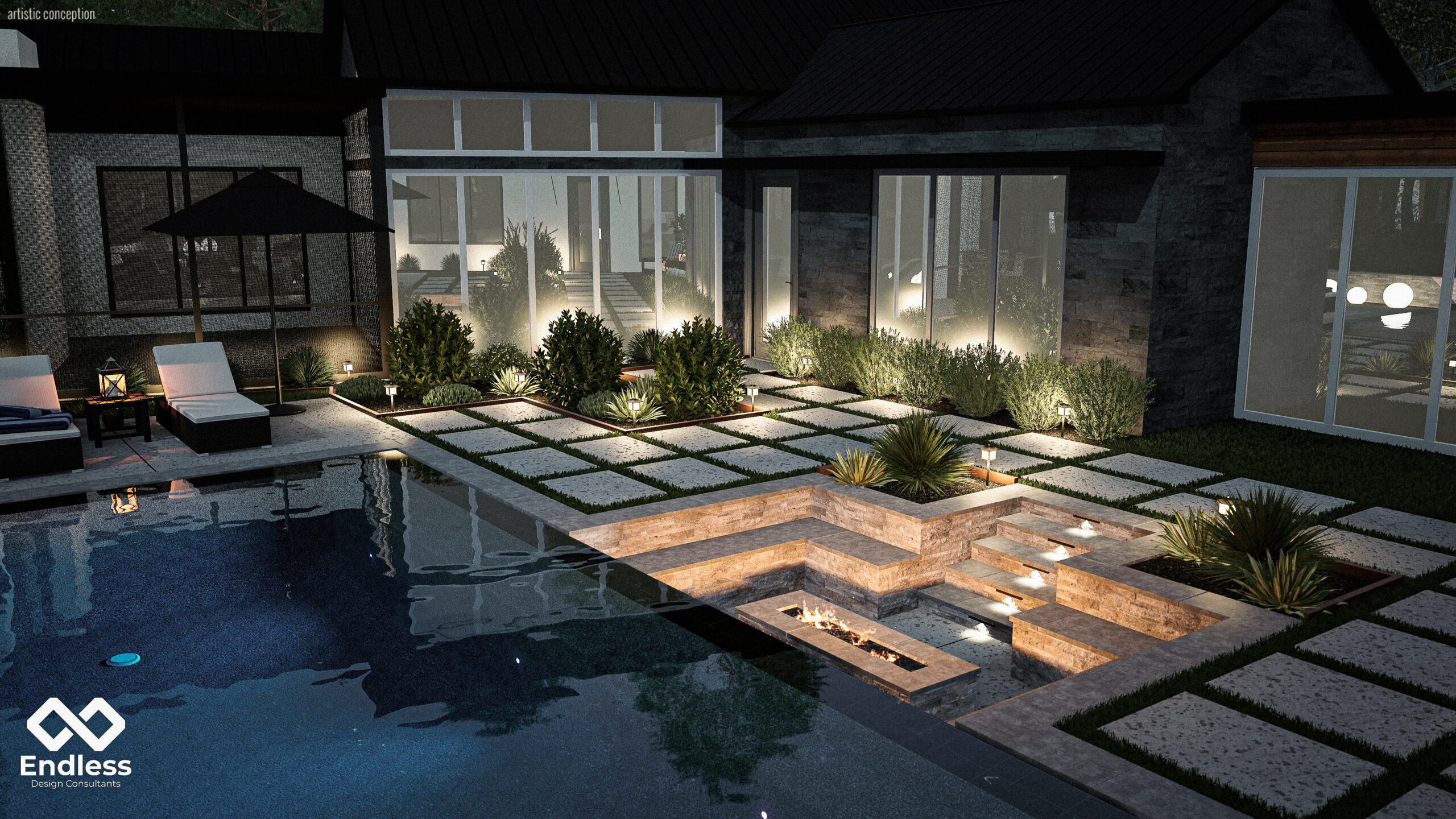 A sunken fire pit seating area is carved directly into the landscape, creating an intimate gathering space that contrasts with the openness of the pool deck while maintaining strong visual connection throughout the site. Subtle lighting, structured planting beds, and crisp hardscape detailing reinforce a balanced composition that feels both refined and highly livable, supporting relaxation, social gathering, and year-round use.